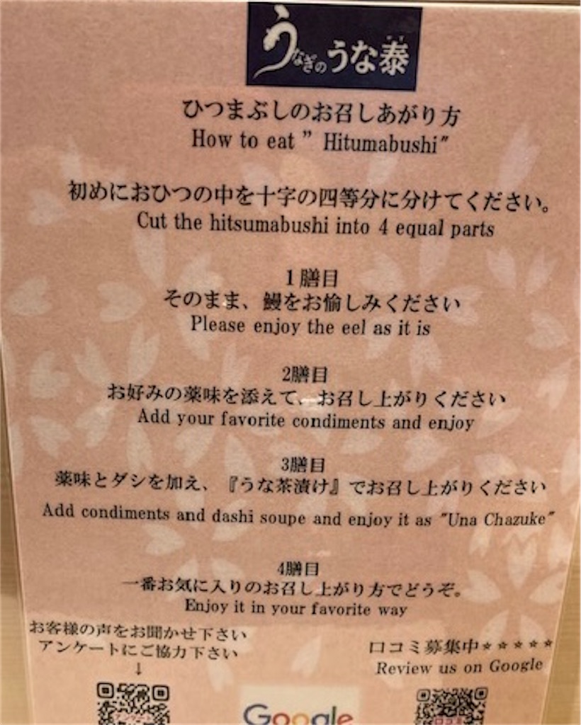 食べ方もちゃんと書いてあります。これは大抵、どこのひつまぶしのお店でも書いてますね。